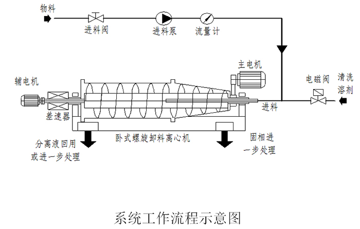 下圖描述了離心機(jī)的主要設(shè)備和系統(tǒng)進(jìn)行工作時(shí)的工藝流程,該系統(tǒng)主要包括臥式螺旋卸料沉降離心機(jī)(主機(jī))、電器控制系統(tǒng)、無軸輸送機(jī)、自動(dòng)控制加藥系統(tǒng)。